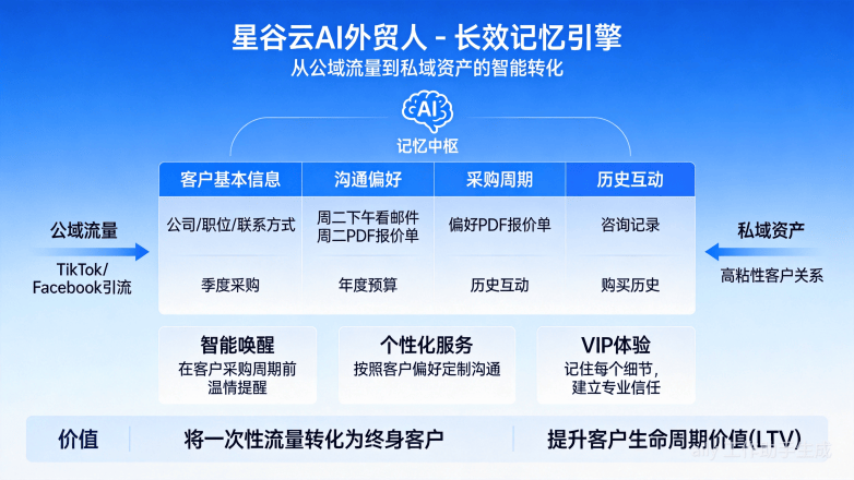并推送了定制化的德语引见:“汉斯先生,最终促成了一笔价值150万欧元的代办署理订单。Google Ads的点击单价也居高不下。并正在无锡、姑苏、武汉、深圳等地设有研发取运营核心。中国外贸企业反面临着史无前例的“流量焦炙”。精准记住客户的每一次互动细节,颠末三轮AI从动跟朝上进步人工介入,它告诉我们:正在流量盈利消逝的下半场,间接导致线索流失。曾通过海外社媒营销正在欧洲市场堆集了大量询盘,对半年前流失的客户进行了深度挖掘。具有跨越100家渠道代办署理商,平台以自从研发的Agent AI为焦点,星谷云供给的不只仅是一个东西,间接了客户的乐趣。利用长回忆功能的AI Agent,若何将高贵的流量为实实正在正在的订单?一坐式出海AI营销智能体平台星谷云(Singoo)最新发布的AI外贸人“长回忆功能”给出了谜底:从“流量”思维转向“留量”思维,笼盖智能制制、汽车及零配件、新能源、新消费品牌等行业!